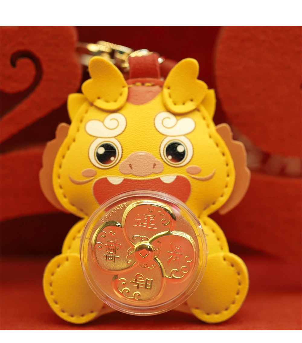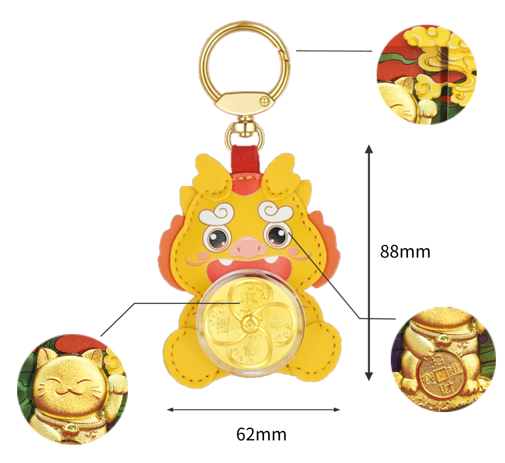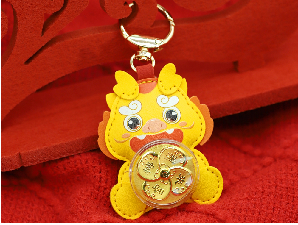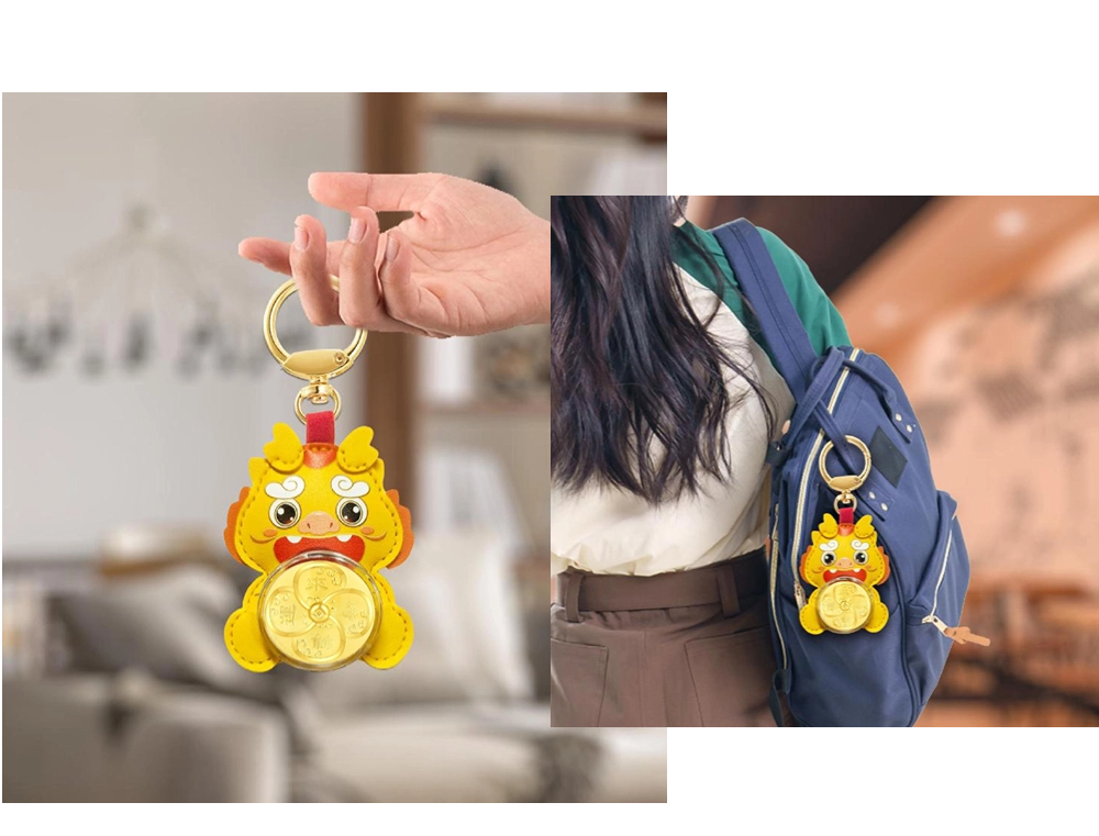 | 时来运转,时至财升,运来财涌。本产品以小黄龙外形为主,卡通风格的小黄龙软萌可爱,皮质手感极佳。以转轴承接四叶草外形的时来运转小金片、结合海浪纹等吉祥招财元素,创造出图形与吉祥寓意完美结合的艺术形式,寓意时来运转,吉祥平安。 | |