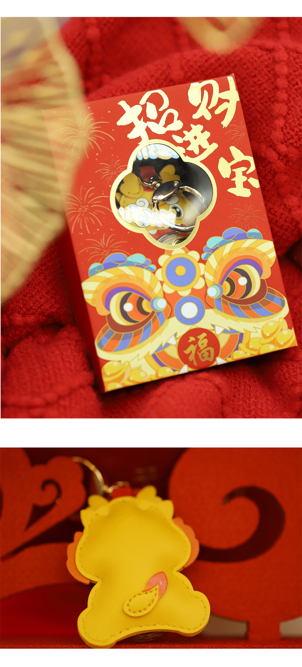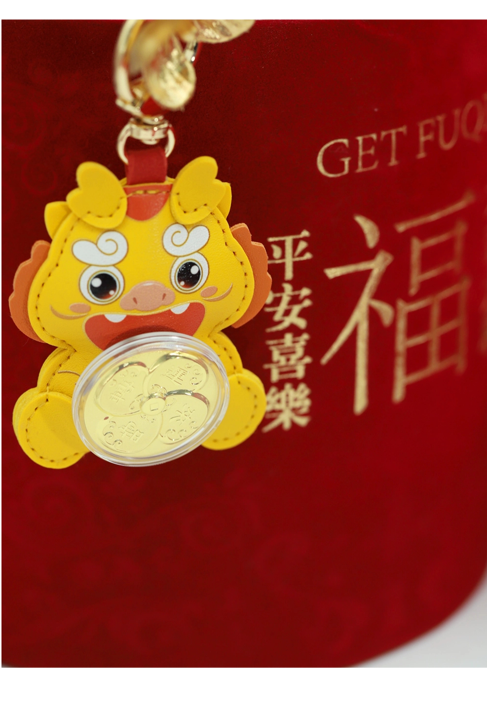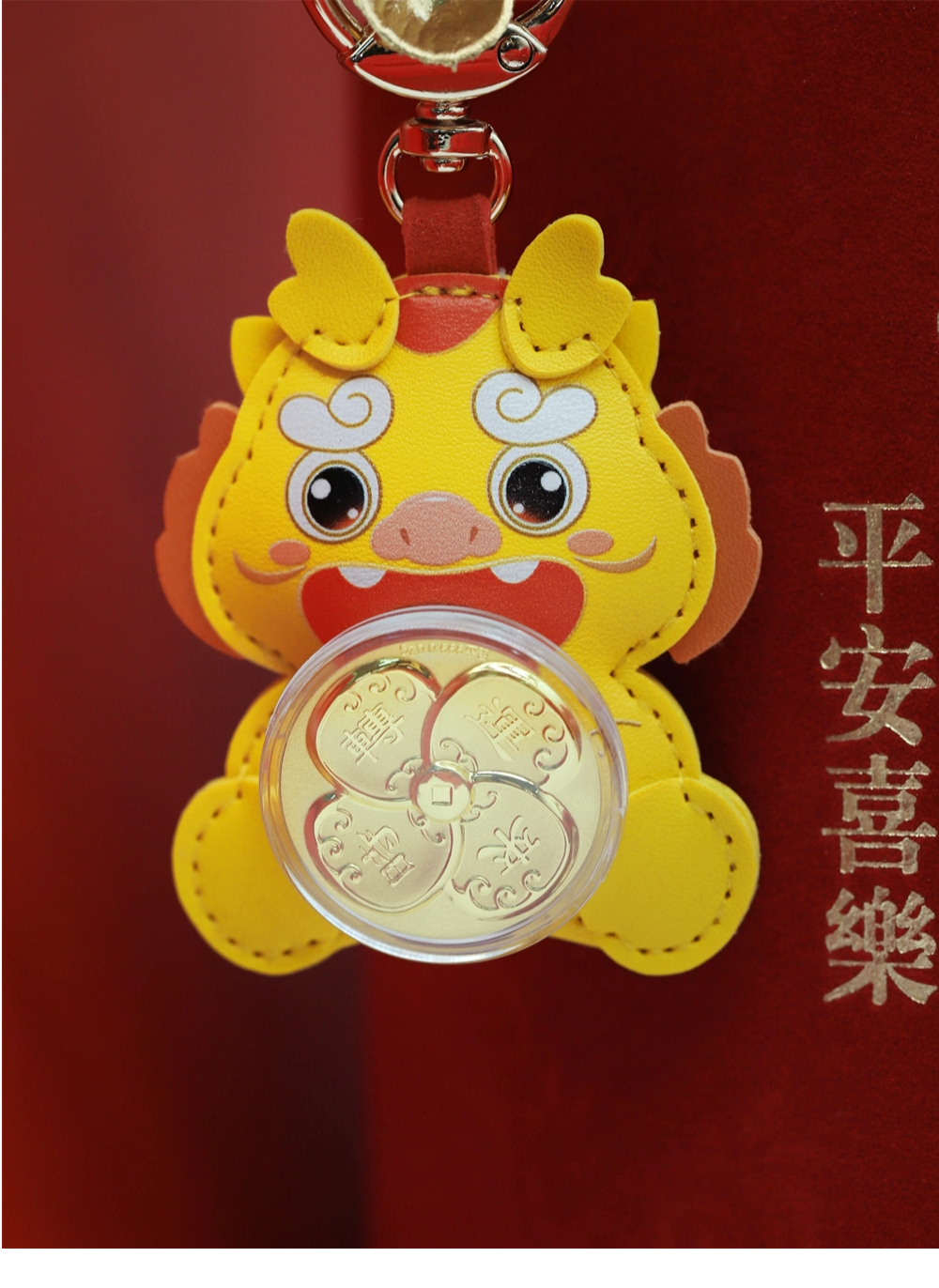 | 时来运转,时至财升,运来财涌。本产品以小黄龙外形为主,卡通风格的小黄龙软萌可爱,皮质手感极佳。以转轴承接四叶草外形的时来运转小金片、结合海浪纹等吉祥招财元素,创造出图形与吉祥寓意完美结合的艺术形式,寓意时来运转,吉祥平安。 | |